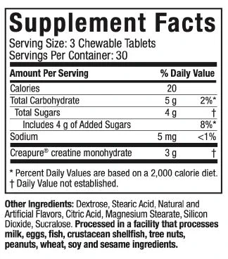 MuscleTech Creatine Chews offer a convenient and delicious way to experience the muscle-building benefits of creatine. Each serving packs a research-backed dose of 3 grams of Creapure® creatine monohydrate, a highly regarded and rigorously tested form of creatine. This means you can ditch the messy powders and shakers and enjoy a tasty, chewable alternative that delivers the same powerful results. Creatine Chews by MuscleTech provide an easy-on-the-go option for your daily creatine supplementation, each chew contains 1g of CreaPure which provides the benefit of: