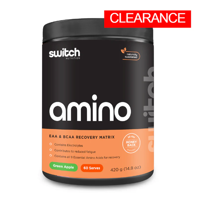 Are you ready to SWITCH ON your recovery? Switch Nutrition Amino Switch is a highly absorbed Vegan Friendly Branched Chain Amino Acid (BCAA) and Essential Amino Acid (EAA) supplement! Containing all 9 EAA’s in the perfect human ratio, which is designed to help SWITCH ON muscle recovery and SWITCH OFF muscle breakdown! Switch Nutrition uses the Master Amino Acid Profile (MAP) to maximize Net Nitrogen utilisation, which provides you with the greatest amino acid absorption. Amino Switch also contains essential co-factors, perfectly balanced electrolytes & b-vitamins to reduce fatigue, support energy and boost nitric oxide without the added calories!